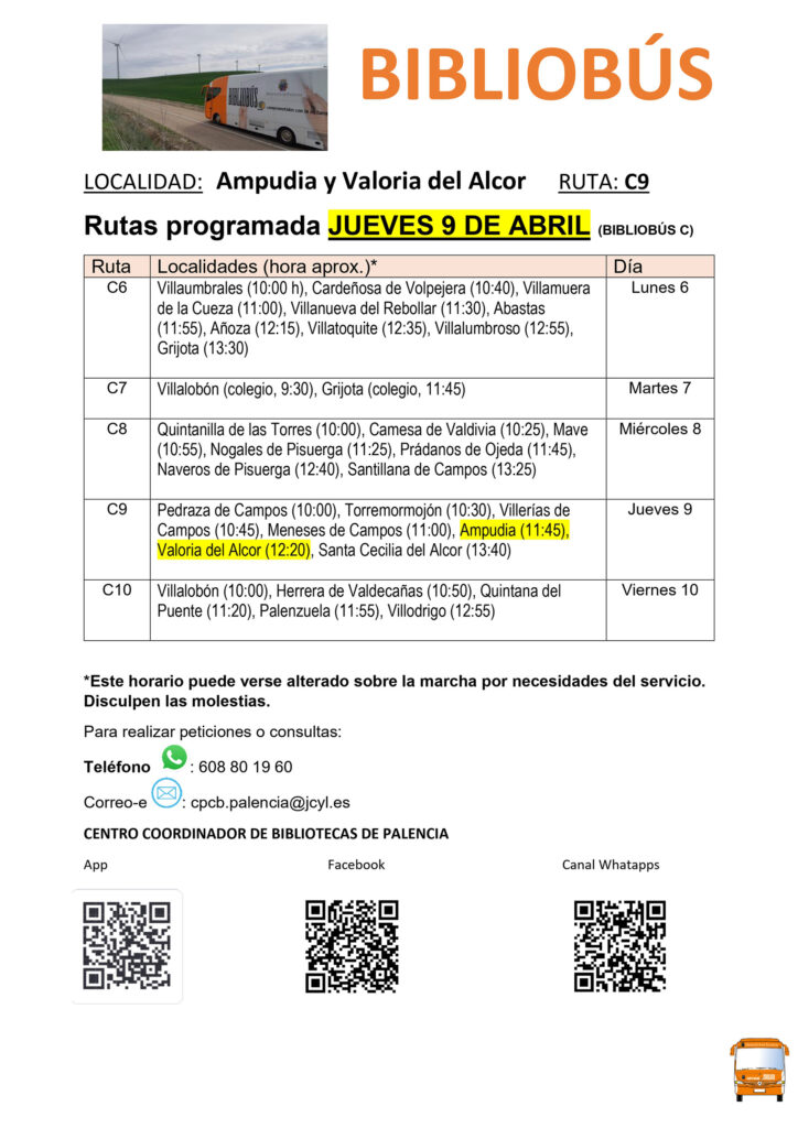 Eventos Bibliobús Jueves 9 de abril Ampudia 11:45h. y Valoria del Alcor 12:20h.ampudiaADMIN6 de abril de 2026